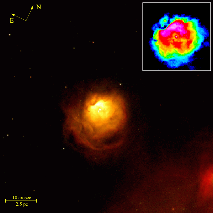 Parker et al. (1992) derived a more luminous exciting star with MV=-5.1 mag corresponding to an O6V type. The reason for this discrepancy is that they measure a V magnitude which is 0.48 mag brighter than our Strömgren y and also use a stronger visual extinction of AV = 0.8 mag. A magnitude offset of this type could be attributed to the fact that the exciting stars are tightly packed inside a very bright 2 region, making sky subtraction difficult.