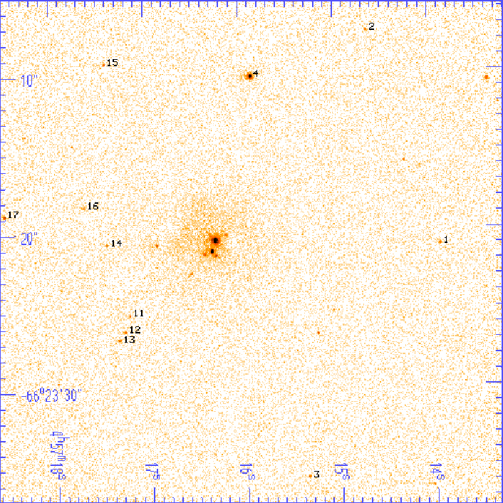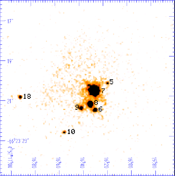 The automatic search routine daofind detected 18 stars in the WFPC2 field of N11A, all of them unambiguously present in the four stellar filters (Fig. 5) with their magnitudes ranging from y=14.69to 20.23. The photometry measurements for these stars are presented in Table 2, where the star numbers refer to Figs. 2 and 4.