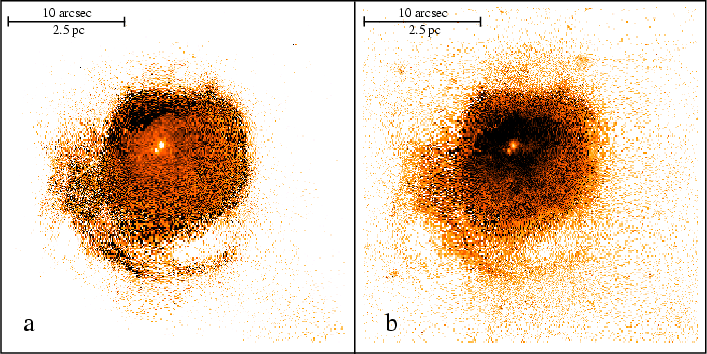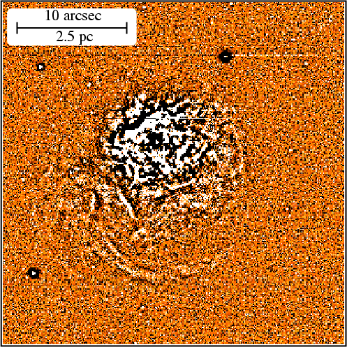 The morphology of N11A is well accounted for by the champagne model (Tenorio-Tagle 1979; Bodenheimer et al. 1979). It corresponds to the evolutionary stage when the ionization front has reached the border of the molecular cloud. The central bright area (Fig. 1) is the cavity created in the molecular cloud by the ionizing photons of the stars, and the bright ridge is a part of the cavity situated along the line of sight. Dense ionized gas is pouring out of the cavity into the interstellar medium as shown by the presence of the outer diffuse component. Since the line of sight is slightly tilted with respect to the outflow axis, a part of the cavity and the associated external dust hides a portion of the 2 region and causes the higher extinction observed at its north-east side. The surrounding filamentary structure (Fig. 3) is probably created by the stellar winds from the central cluster acting on the dense ionized gas at the surface of the molecular cloud.