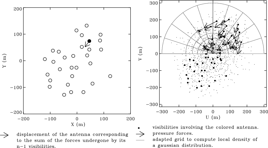 This method offers several advantages. First, the convergence is self-driven: there is no need to optimize blindly any quantity in a space of parameters nor to use random picking (like in Keto 1997). At each step the distribution contains in itself the way the configuration should evolve. The risk of getting caught in resonant oscillations is avoided by allowing only small displacements for the antennas i.e. by setting g to a small value. Second, the main computational cost is in the calculation of the pressure force which is a simple operation. Finally, it is very flexible and may be used for any 2d model distribution, with ground constraints, and can handle Earth rotation synthesis, multi-configuration observations and mosaicing.