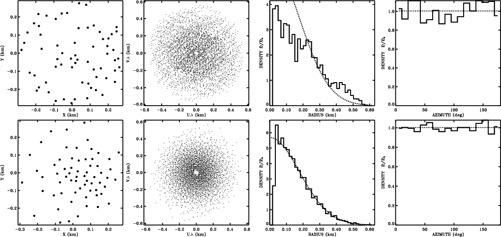 Figure 3: Example of optimization: a configuration of 64 antennas is optimized for a Gaussian distribution of Fourier samples. The first row shows the initial randomly picked configuration, its Fourier samples and the radial and azimuthal profiles of the density of Fourier samples. The second row shows the same for the optimized configuration. The model distribution is represented by the dashed lines in the radial and azimuthal profiles. The optimal distribution of antennas is expected to be Gaussian, this property is checked in Fig. 4. |