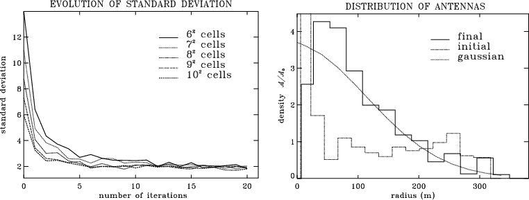 Without going into a full convergence analysis, it seems reasonable to think that, if there is still some discrepancies between the model and the actual distribution, at least for one antenna the sum of the pressure forces on its Fourier samples will not cancel out and it will be moved to improve (if it can be improved) the distribution. If the distribution can not be improved the configuration will oscillate around the optimal one and by decreasing g along iterations it should converge. In other words the method seems capable of avoiding local minima and it was therefore decided to stop the optimization process when the standard deviation between the actual distribution and the model reaches a stable minimum. If there is no rigorous proof that this configuration is indeed the best one, one can hope that it is close to it and at least that it fits satisfactorily the requirements on the distribution of Fourier samples.