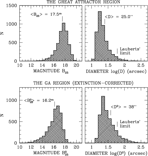 The "extinction-corrected'' magnitude and diameter distributions of the galaxies in the GA region
