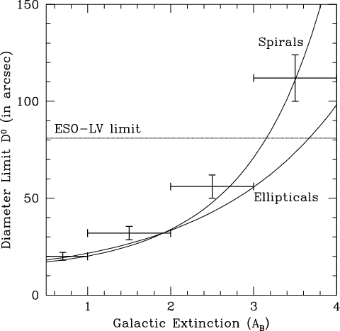 Lauberts (1982) diameter limit. In the absence of the obscuration by the Milky Way, Lauberts would have detected