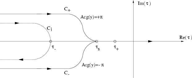 we take into account the exact branch cut along the real axis in order to obtain the correct high density tail. This is shown by the contour labeled "