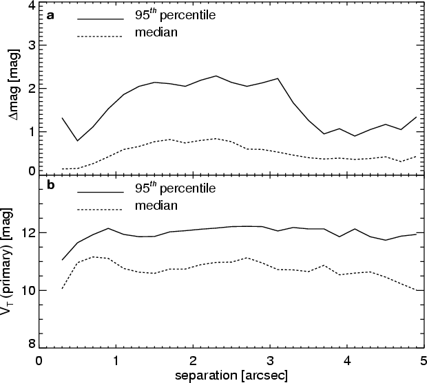 and seldom fainter than 12 mag. For separations below 1 arcsec, the