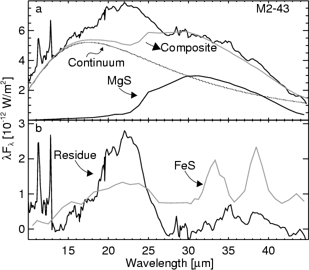 Secondly, the presence of iron sulfide in these nebulae may be due to an unusually high S/Mg ratio. However, this is unlikely since neither S nor Mg are produced during the evolution of these objects requiring these peculiar abundance patterns to be present throughout the material from which these stars formed.