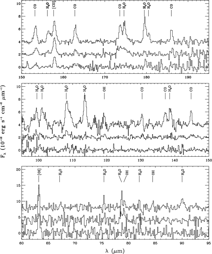 Figure 1: ISO-LWS spectra observed towards IRAS 4 on source (top line), NE-red (middle line) and SW-blue (bottom line). |