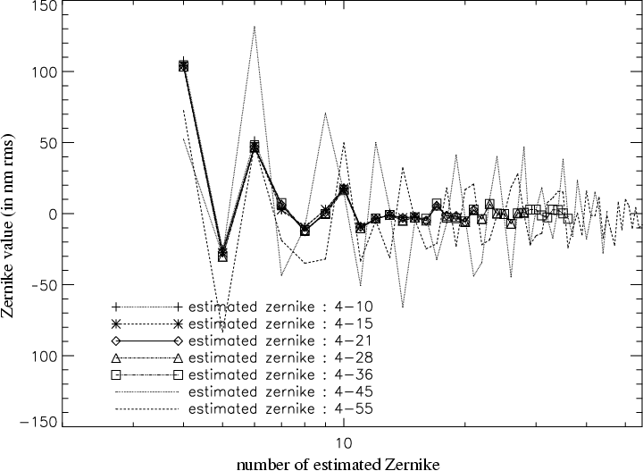 There exists a limit to the number of Zernike polynomials that can be estimated with a reasonable accuracy. Of course this limit depends on the signal to noise ratio on the images. In the present case, this number is equal to 36. Note that if a more sophisticated regularization term is introduced in the PD algorithm both on the object and the aberrations this limitation should be overcome. Nevertheless such a regularization is not needed here since the aberration amplitudes are negligible (less than a few nanometers) for Ziabove i=11 (i.e. the spherical aberration). The WFE between estimated Zernike coefficients 4-15 and estimated Zernike coefficients 4-36 is about 1.3 nm RMS. This WFE is very small and thus shows that the aliasing of the Zernike polynomials above 15 on the estimated coefficients 4-15 is negligible.