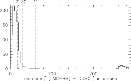 DCMC catalogues, using a search radius of
