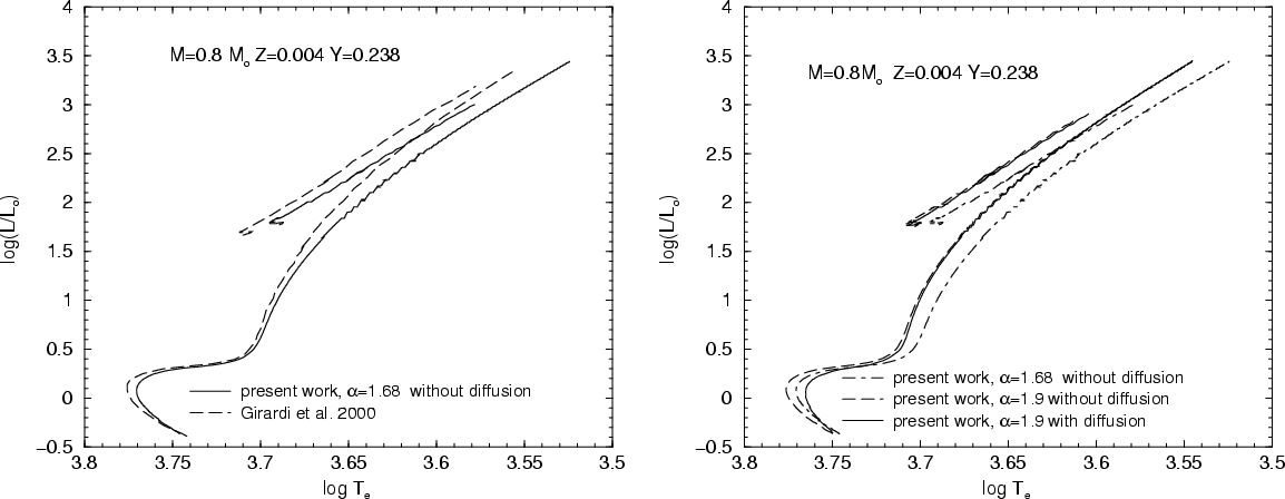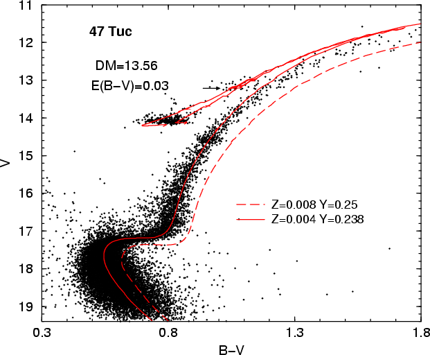 superimposed 10 Gyr isochrones with Z=0.004 Y=0.238 (solid line) and Z=0.008 Y=0.25 (long dashed line), as evaluated by adopting a mixing