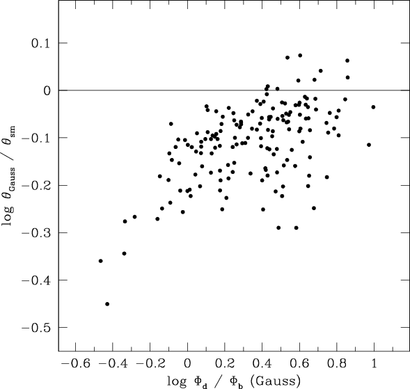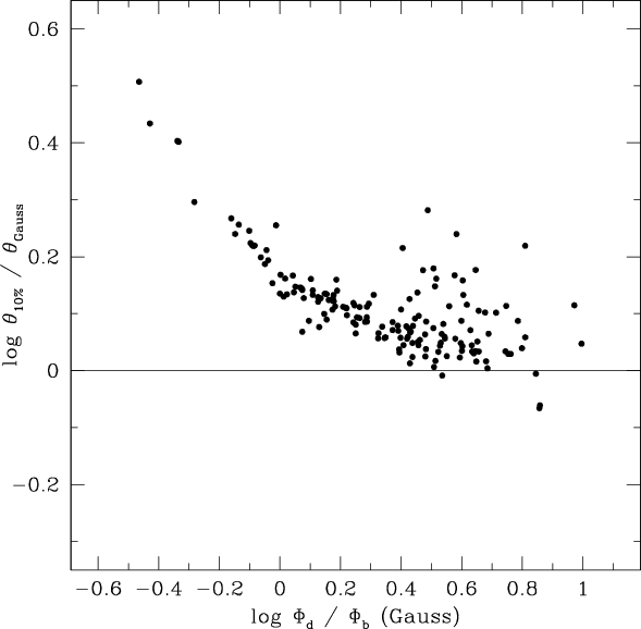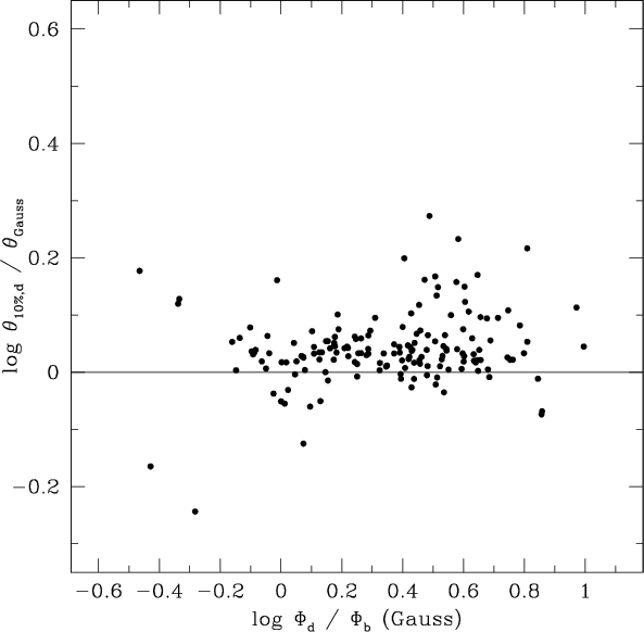 measurements at the 10% level of the peak surface brightness, Gaussian