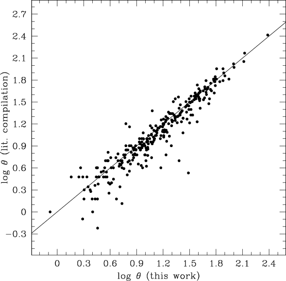 Figure 9: Comparison of the PN diameters from the literature compilation (see text) with the diameters from this work (geometric means from the two dimensions given in Table 2). Solid line: 1 to 1 relation. |