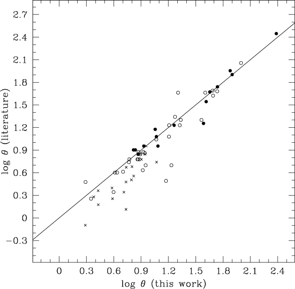 Figure 10: Comparison of the PN diameters from Aaquist & Kwok (1990) (crosses) and Zijlstra et al. (1989) (full circles - from 10% contour, open circles - from Gaussian deconvolution) with the diameters from this work (geometric means from the two dimensions given in Table 2). Solid line: 1 to 1 relation. |