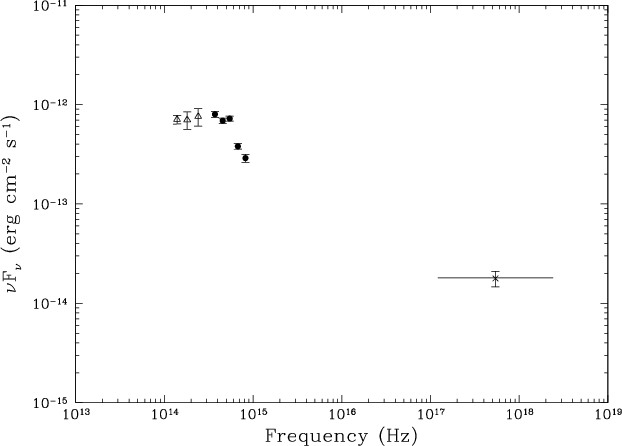 Figure 3: Broad-band SED of NGC4168-ULX1 composed of data from XMM-Newton (X-ray, cross), Loiano (optical, filled dots), and 2MASS (NIR, open triangles). Optical and NIR data were corrected for the Galactic absorption along the source line of sight. The presence of a peak in the SED across the optical-NIR domain isapparent. |