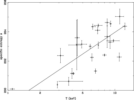 Figure 11: Relation between the gas integrated specific entropy and the mean gas temperature taken from the literature (see text). The point at the lower left corner corresponds to the group HCG 62. |
