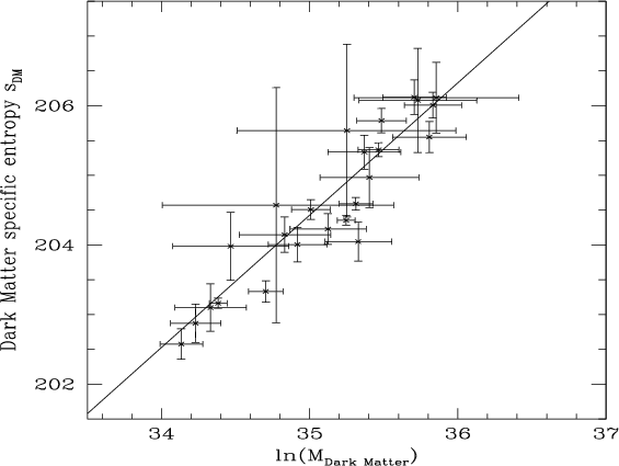 Figure 13: Relation between the dark matter integrated specific entropy and mass. The best fit line is indicated (see text). |
