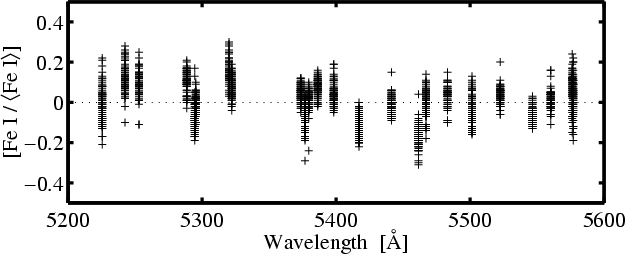 To determine the stellar atmospheric parameters we made use of Fe I lines since they have a wide coverage of line strengths as well as excitation potentials. Fe I (e.g. viz. Fe II) is also by far the most common ion in terms of number of lines in a stellar spectrum.