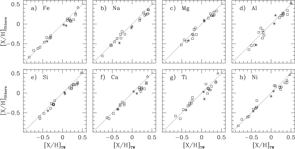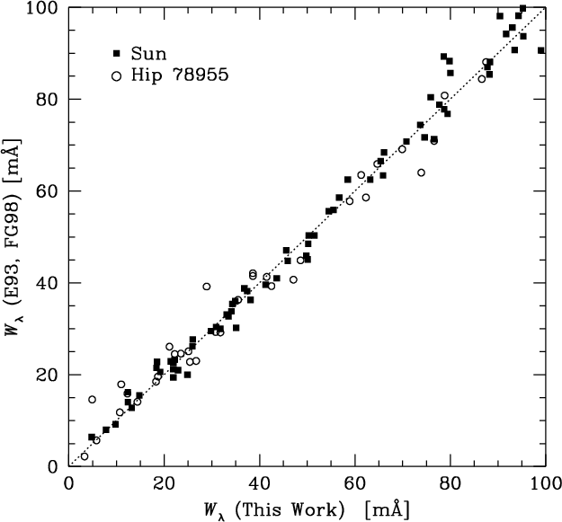 \par\resizebox{8.8cm}{!}{\includegraphics{h4451f4.eps}}\end{figure} Figure 4: Equivalent widths measured in the Sun and the metal-rich star Hip 78955. Comparison for the Sun (filled squares) is made to Edvardsson et al. (1993) (E93), while equivalent widths for Hip 78955 (open circles) are compared to those measured in Feltzing & Gustafsson (1998) (FG98). Equivalent widths from this study are plotted on the abscissa.