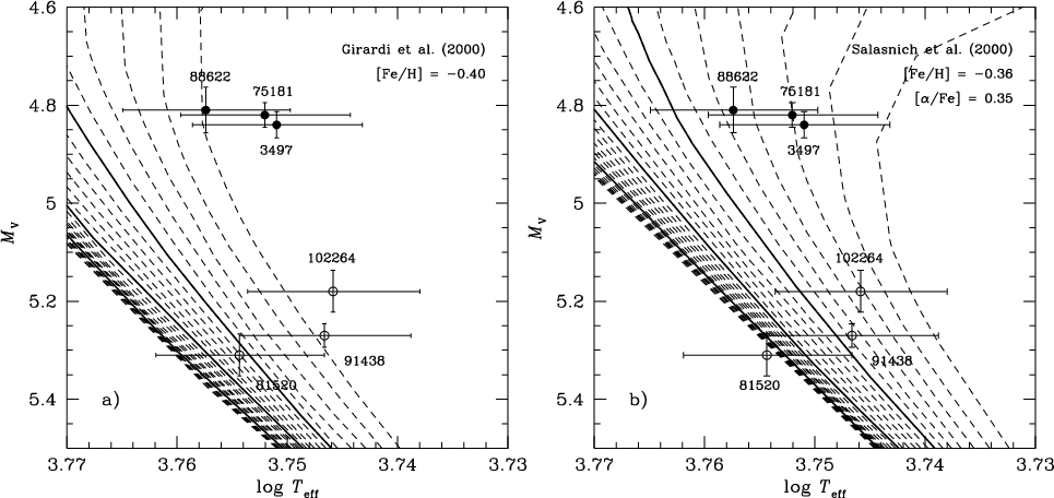 Stellar masses were estimated from the evolutionary tracks by Girardi et al. (2000) and Salasnich et al. (2000) with the same metallicities and $\alpha $-enhancements as described in Sect. 8. Figure 5 shows an example for stars with $\rm [Fe/H]<-0.5$, using the $\alpha $-enhanced tracks from Salasnich et al. (2000) with a metallicity of -0.74 dex.
