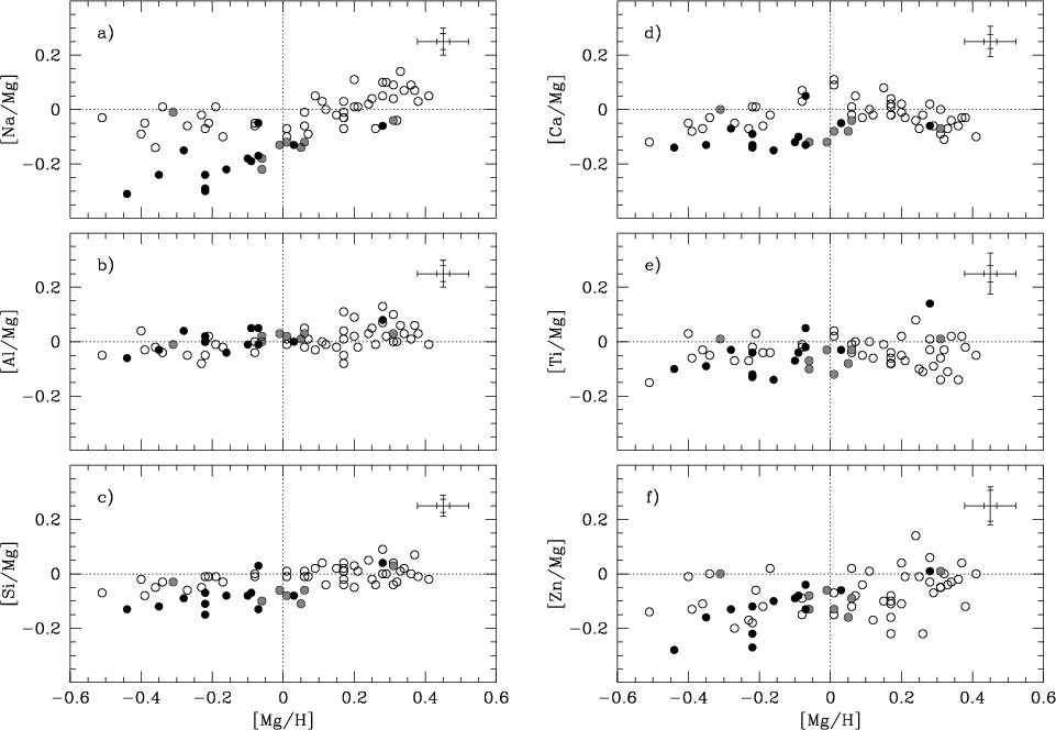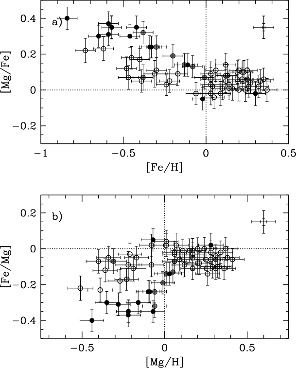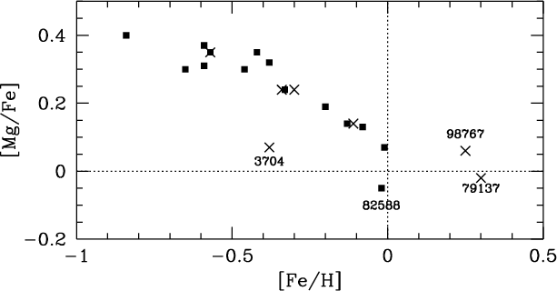 Figure 17 shows the $\rm [Mg/Fe]~ vs.~ [Fe/H]$ trends with the thick disk sample split into the two velocity groups. We have a well defined abundance trend for the stars with $V_{\rm LSR} < -60~~{\rm km~s^{-1}}$ (filled squares). The trend is the same for the stars with $V_{\rm LSR} > -60~~{\rm km~s^{-1}}$ although not as well sampled (crosses). Also, the one deviating thick disk star (Hip 3704) is in the sample with the larger $\langle R_{\rm m} \rangle$ and can thus readily be attributed to thin disk contamination (see Sect. 9.4).