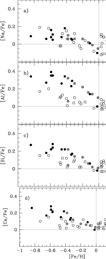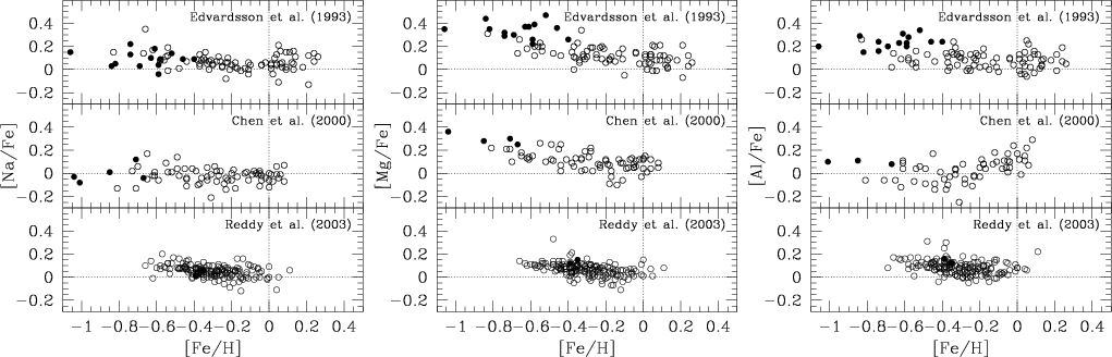 This means that the star formation rate in the thick disk must initially have been fast to allow the build-up of $\alpha $-elements from SN II to high metallicities before the enrichment from SN Ia. The horizontal position of the "knee" sets a lower limit to how long the star formation went on for in the thick disk. An often quoted time-scale for SN Ia to contribute to the chemical enrichment is one billion years. However, depending on the star formation rate this time-scale might be shorter. In e.g. Matteucci (2001) it is shown how, in a bursting scenario, the SN Ia rate peaks after only a few hundred million years, i.e. significantly earlier.