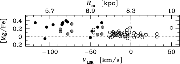 Figure 16 shows $\rm [Mg/Fe]$ versus $V_{\rm LSR}$ and it so happens that our thick disk sample has two main groupings, which also can be seen in Fig. 3; one around $V_{\rm LSR}\simeq-40~~{\rm km~s^{-1}}$ and one around $V_{\rm LSR}\simeq-80~~{\rm km~s^{-1}}$ or $\langle R_{\rm m} \rangle\sim7.0$ kpc and $\langle R_{\rm m} \rangle\sim6.0$ kpc. The innermost sample should have a minimum of contamination of thin disk stars with thick disk kinematics.