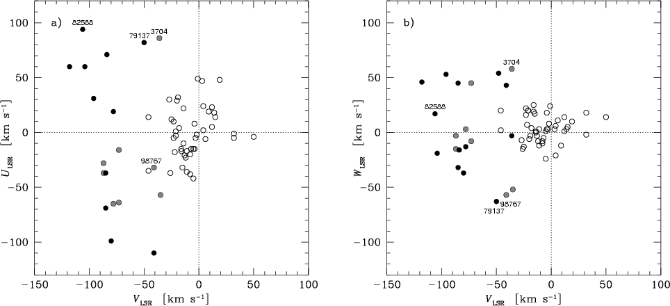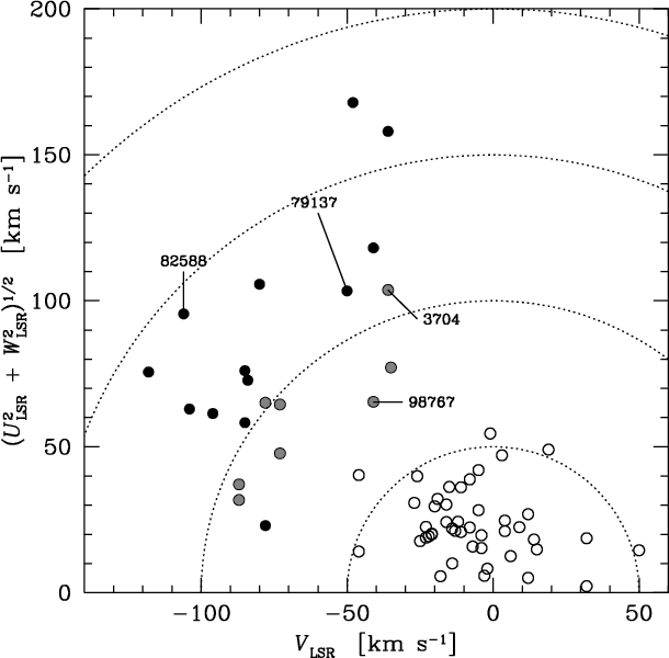 \par\resizebox{8.6cm}{!}{\includegraphics{h4451f3.eps}}\end{figure} Figure 3: Toomre diagram for our stellar sample. Dotted lines indicate constant peculiar space velocities, $v_{\rm pec}=(U^{2}_{\rm LSR}+V^{2}_{\rm LSR}+W^{2}_{\rm LSR})^{1/2}$, in steps of 50 km s-1. Stars that we discuss in Sect. 9.4 have been identified with their Hipparcos numbers. Thin disk stars are marked by empty circles and thick disk stars by filled (black: TD/D > 10, grey: 1 < TD/D < 10) circles.
