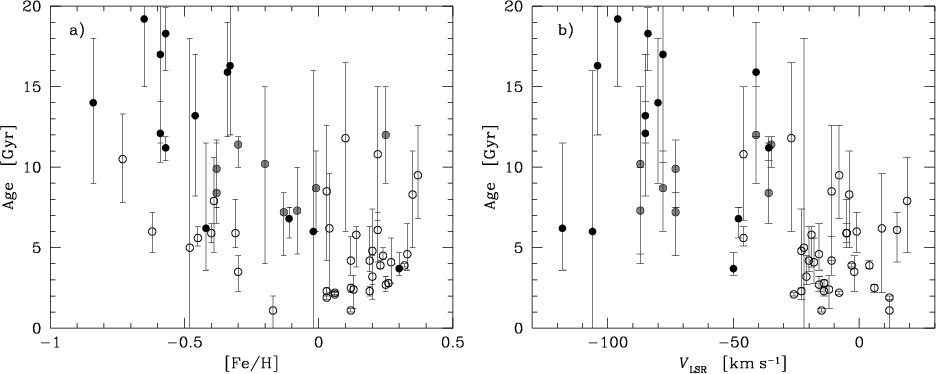 \includegraphics[bb=18 144 592 630,clip]{h4451f43.eps}}\end{figure} Figure 19: a) Stellar ages versus $\rm [Fe/H]$ and b) versus $V_{\rm LSR}$. The error-bars represent the lowest and highest possible ages inferred by the errors introduced by parallaxes and effective temperatures in the fitting of the isochrones, see Fig. 11, Sect. 8, and Table 2. Thin disk stars are marked by empty circles and thick disk stars by filled (black: TD/D > 10, grey: 1 < TD/D < 10) circles.