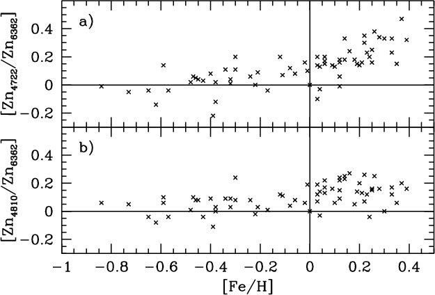 \par\resizebox{8.8cm}{!}{\includegraphics{h4451f44.eps}}\end{figure} Figure B.1: The difference between Zn abundances when derived from a) the $\lambda \lambda $4722, 6362 Å lines, and b) the $\lambda \lambda $4810, 6362 Å lines. The $\log gf$-values for all three lines are astrophysical.