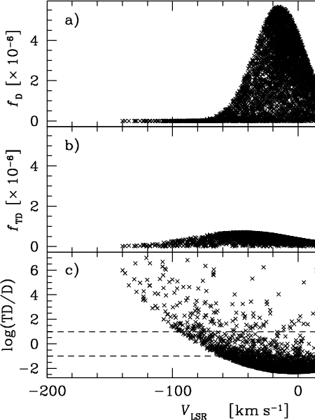 \par\resizebox{8.8cm}{!}{\includegraphics{h4451f1.eps}}\end{figure} Figure 1: a) and b) show the $f_{\rm D}$ and the $f_{\rm TD}$ "probabilities", Eq. (1), and c) the TD/D relative probabilities, Eq. (3). Dashed lines indicate TD/D = 10 and TD/D = 0.1.