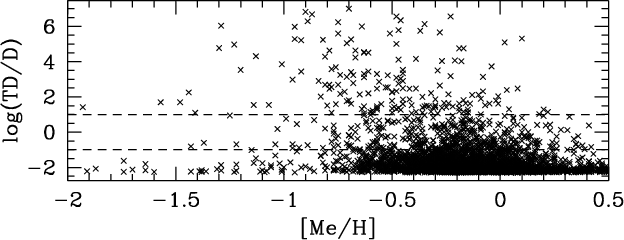 \par\resizebox{8.8cm}{!}{\includegraphics{h4451f2.eps}}\end{figure} Figure 2: The TD/D "relative probabilities" versus photometric metallicity for the whole catalogue. Dashed lines indicate TD/D = 10 and TD/D = 0.1.