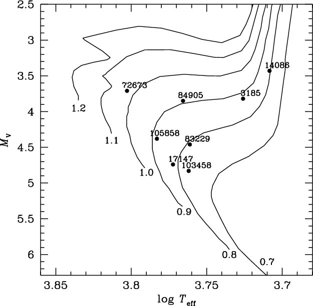 \par\resizebox{8.8cm}{!}{\includegraphics{h4451f5.eps}}\end{figure} Figure 5: Example of mass estimates. The evolutionary tracks are from Salasnich et al. (2000) and have a metallicity of -0.74 dex, and the masses they represent are indicated in the figure. The stars shown have $\rm [Fe/H]<-0.5$ and their Hipparcos numbers have been indicated.