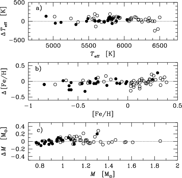 \par\resizebox{8.8cm}{!}{\includegraphics{h4451f6.eps}}\end{figure} Figure 6: The difference between our final $\rm [Fe/H]$, $T_{\rm eff}$, and $\mathcal{M}$ and the starting values from Feltzing et al. (2001) as functions of our $\rm [Fe/H]$, $T_{\rm eff}$, and $\mathcal{M}$. Thick and thin disk stars are marked by filled and open circles, respectively.