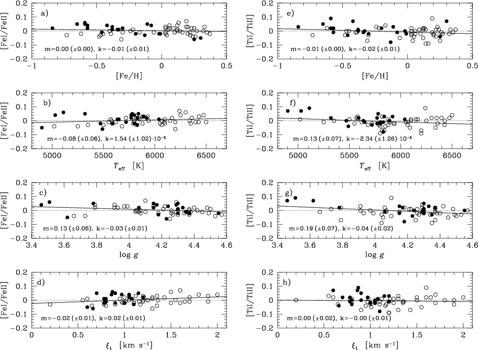 \includegraphics[bb=18 144 592 350,clip]{h4451f7h.eps}}\end{figure} Figure 7: [Fe I/Fe II] and [Ti I/Ti II] versus [Fe/H], $\log T_{\rm eff}$, $\log g$, and $\xi _{\rm t}$. Thin and thick disk stars are marked by open and filled circles, respectively. In each plot we also show, with a solid line, a least square fit and we give the coefficients, slope (k) and constant (m).