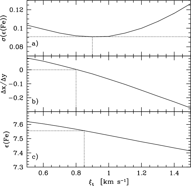 \par\resizebox{8.8cm}{!}{\includegraphics{h4451f8.eps}}\end{figure} Figure 8: Determination of $\xi _{\rm t}$ for the Sun. a) The standard deviation of the Fe I abundance. The horizontal dotted line indicates the minimum scatter in [Fe/H] and the vertical line the corresponding $\xi _{\rm t}$. b) The slope ( $\Delta x / \Delta y$) when abundances from individual Fe I lines are plotted versus line strength, $\log (W_{\rm \lambda}/\lambda)$. The horizontal dotted line indicates a zero slope and the vertical line the corresponding $\xi _{\rm t}$. c) Solar Fe I abundance versus $\xi _{\rm t}$. The vertical dotted line indicates the value for $\xi _{\rm t}$ that we adopt, and the horizontal line the corresponding solar Fe I abundance.