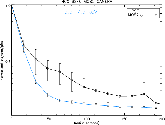 Figure 8: The radial intensity profile of the EPIC MOS1/2 data compared to the instrumental point spread function (PSF; normalized to the maximum flux). The solid line shows the MOS PSF of 6.5 keV and the photons have been selected in the 5.5-7.5 keV range to match the emission from the Fe line complex. Extended emission is detected at distances of about 30'' from the X-ray centroid position. |