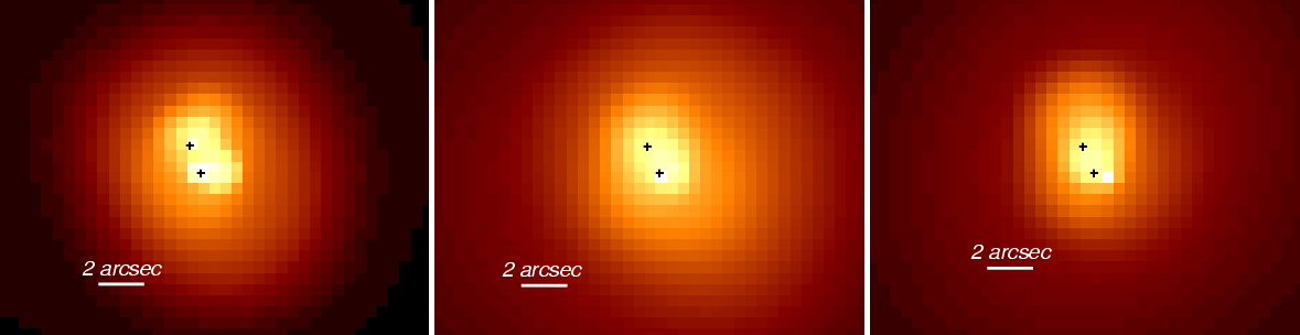 Figure 9: We have binned the Chandra data in three different energy bands as seen by the XMM-Newton spectrum. The crosses mark the position of the two nuclei as detected with Chandra. The left panel shows emission from the neutral Fe K line (selected between 6.1 and 6.35 keV in the observers frame, emission from the ionized lines (middle panel, energy range between 6.4 and 7 keV) as well as emission between 7 and 10 keV from the highly absorbed power-law component (right panel). The spectral capabilities of XMM-Newton in combination with the high spatial resolution of the Chandra telescope gives us a more precise understanding of the nuclear region in NGC 6240. |