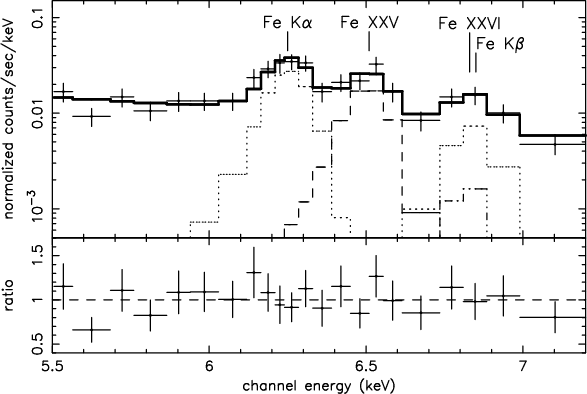 line at 6.4 keV; (ii) an ionized line at about 6.7 keV;