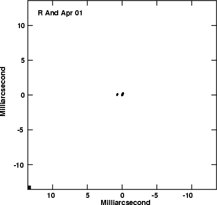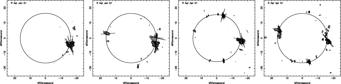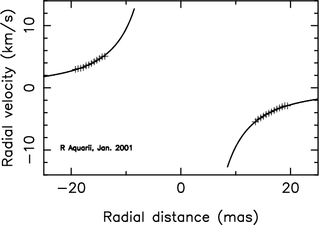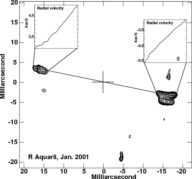 The symbiotic star R Aquarii is quite remarkable in another way; in the January 2001 observations, the emission is dominated by regions of emission which are very extended in the radial direction and are very symmetrically located around the center. The velocity field in these regions is interpreted as showing differential rotation in an equatorial disk of material in the star's atmosphere (see Fig. 15). Systematic variations of the measured radial velocity with position angle along the SiO ring in S Coronae Boralis also suggest a rotation of 3-4 km s-1 but the time variable, peculiar velocities make the case less clear than for R Aquarii.