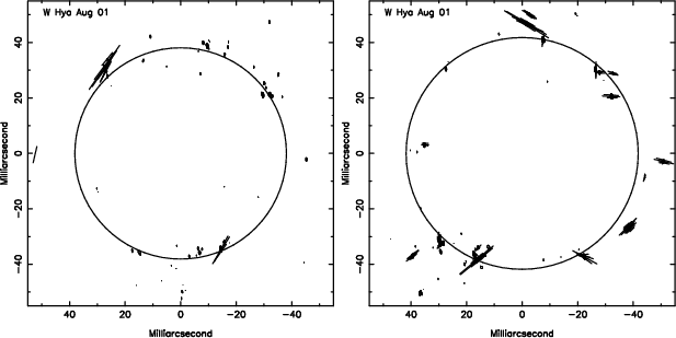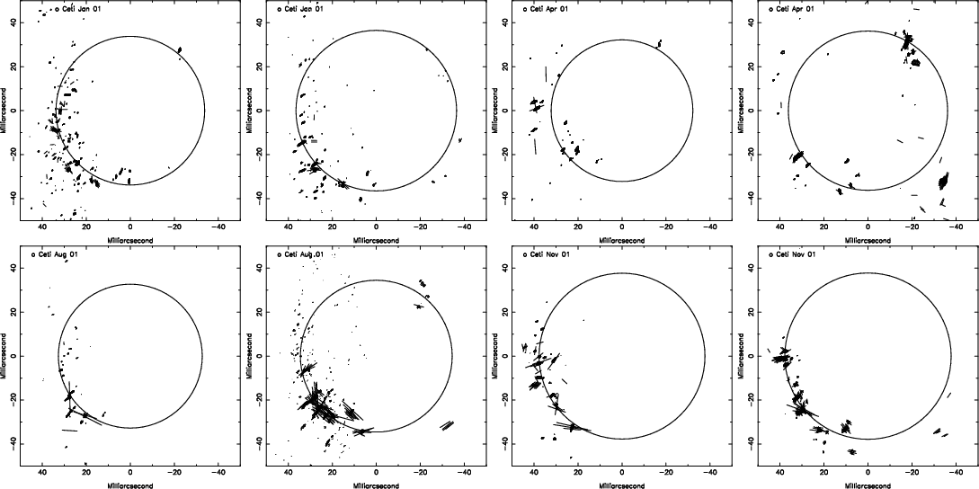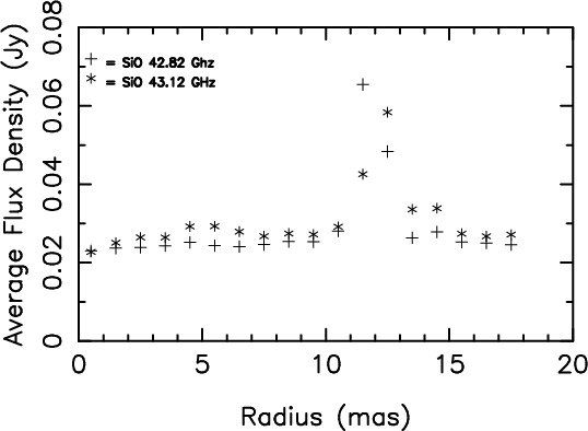 Since the detectable masers are largely in the tangent through the SiO maser layer, all radial velocities, as seen by us, will generally be azithmutal to the star. Thus, the variation in velocity of maser spots in location in the ring and in time is due either to rotation of the star or turbulent motions in the atmosphere. Table 3 gives the flux density weighted average radial velocity observed in 8 sectors around each maser ring. There is some correlation between the velocities observed in the two transitions, as would be expected if the masers arise in the same regions. There are large variations in the sector average velocities in time, even in sectors with a reasonable flux density of masers. These fluctuations of a few km s-1 are undoubtedly due to changes in the large scale bulk motions in the stellar atmosphere.