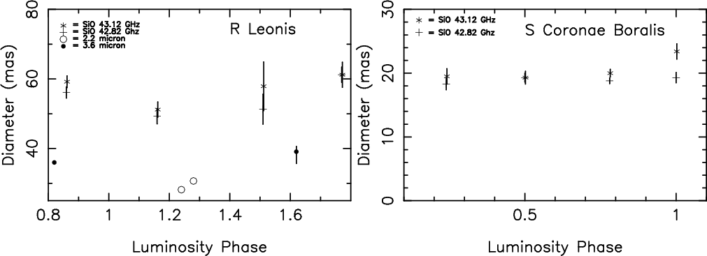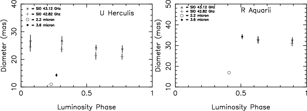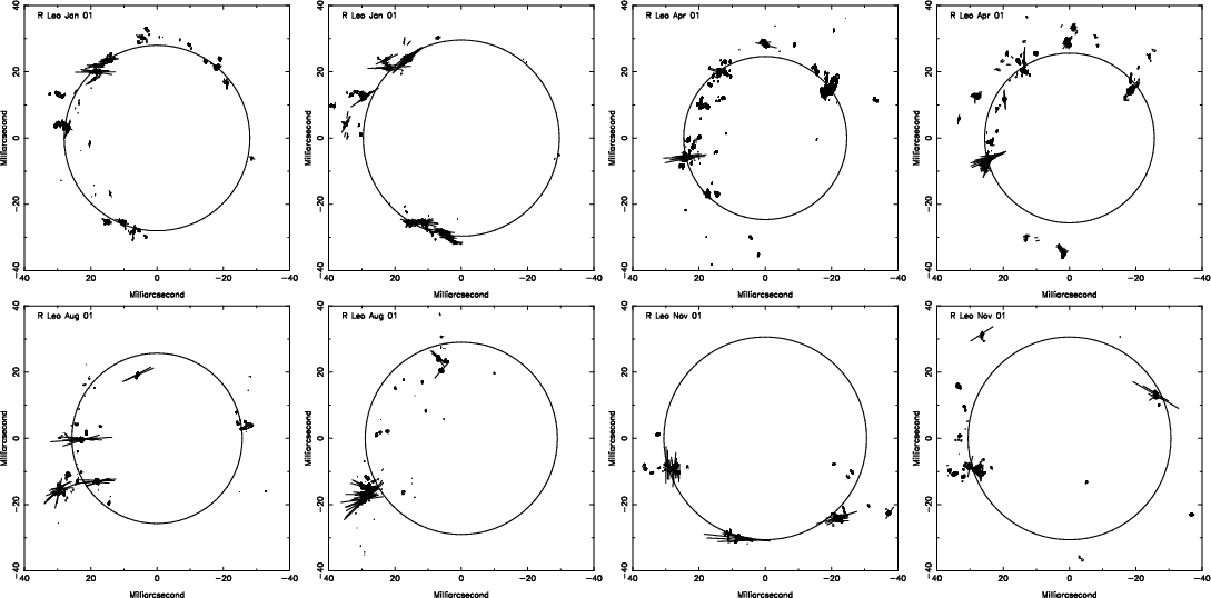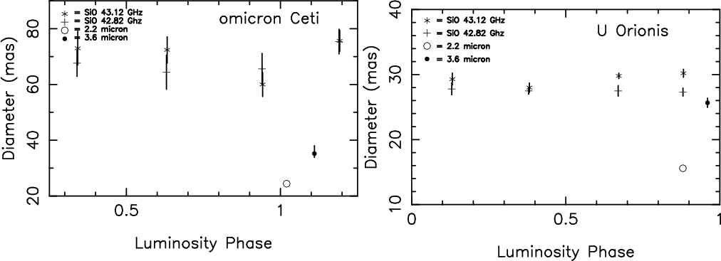 Circumstellar SiO masers tend to occur in clumpy, partial rings centered on the central star (Diamond et al. 1994). (This is presumed to be due to the longer paths through constant velocity gas needed for the masers to develop.) Thus, these masers become markers for the layer in which the physical conditions necessary for the masers exist. The resolution available to VLBI observations is a very small fraction of the diameter of the ring; the limit on the accuracy of the measurement of the ring diameter is determined by the number and distribution of the maser spots. Much of the emission is confined in localized "spots'' with lifetimes of a few months. The theory of maser emission is given in Elitzur (1991), Nedoluha & Watson (1994), Elitzur (1993,1996,1998). Modeling of the dynamics of circumstellar masers is developed in Humphreys et al. (2002,1996) which give plausible agreement with the observations.