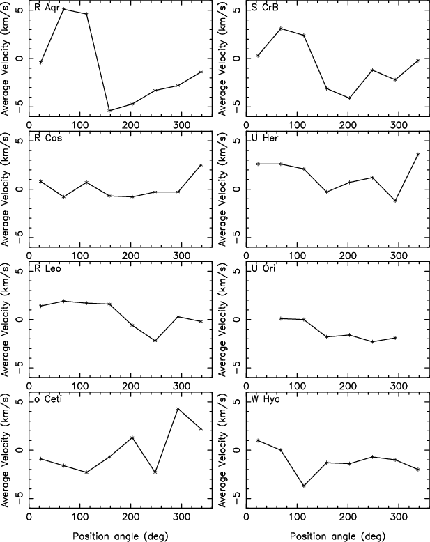 The large bulk non-radial motions seen in the maser spots will tend to mask the signature of the rotation of the star. The stars must be slow rotators due to their enormous size but Fig. 14 strongly suggest rotation is detectable in R Aquarii. Random motions should average out whereas motions due to stellar rotation will not. Figure 17 shows the epoch and transition sector average for the sources in our sample. R Aquarii and S Coronae Boralis show possible rotation of 3-4 km s-1but the others show no convincing evidence of rotation.