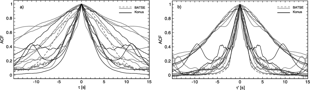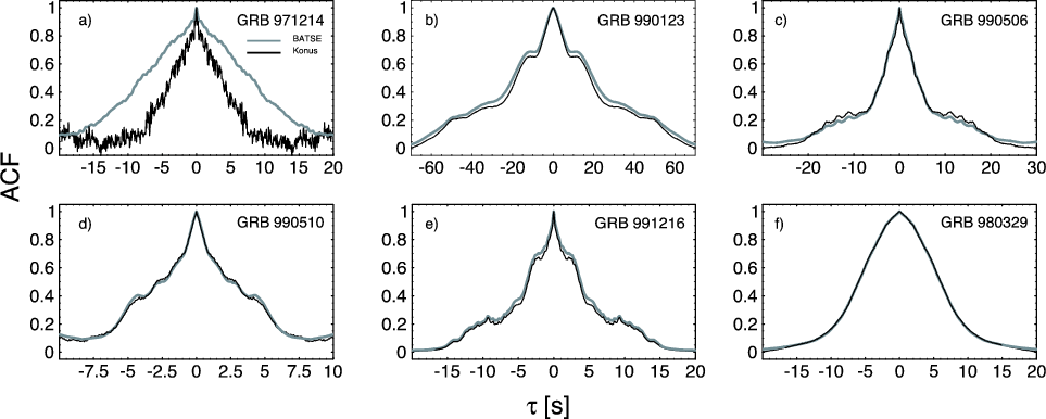 Figure 1: Comparison of the ACFs of 6 GRBs obtained using data from two different experiments. Solid lines: Konus 64 ms data in the 50-200 keV energy band; gray lines: BATSE 64 ms data in the 55-320 keV energy range. There is sufficiently good agreement for the bright bursts, when the results are not very sensitive to the background estimation. GRB 971214 is considerably dimmer than the others (see the text for discussion). |