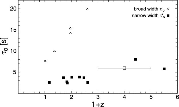 The average PDS of bursts shows an overall power-law behavior, indicative of a self-similar underlying process where there are no preferred timescales. If this is the case, then the width of the ACF is related to the low-frequency cut-off of the PDS, which is due to the finite duration of the burst (Beloborodov et al. 2000). As mentioned in Sect. 1, in principle the information given by the ACF and the PDS is the same. In practice, since they express this information differently, they are affected by noise and window effects in different ways. It would be difficult to make a good estimation of the low-frequency cut-off in the PDS due to the large statistical fluctuations. On the other hand, the width at half-maximum of the ACF gives a robust measure.