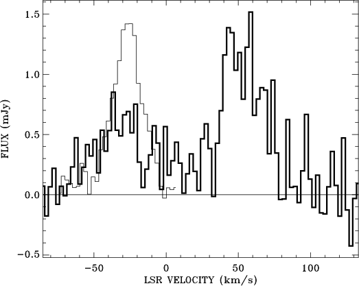The H I spectrum (thick line) taken at the position of the complex from the data of Adler & Westpfahl (1996) and spatially smoothed (beamsize: 18''). The CO(1-0) spectrum of the data inside the 4 |