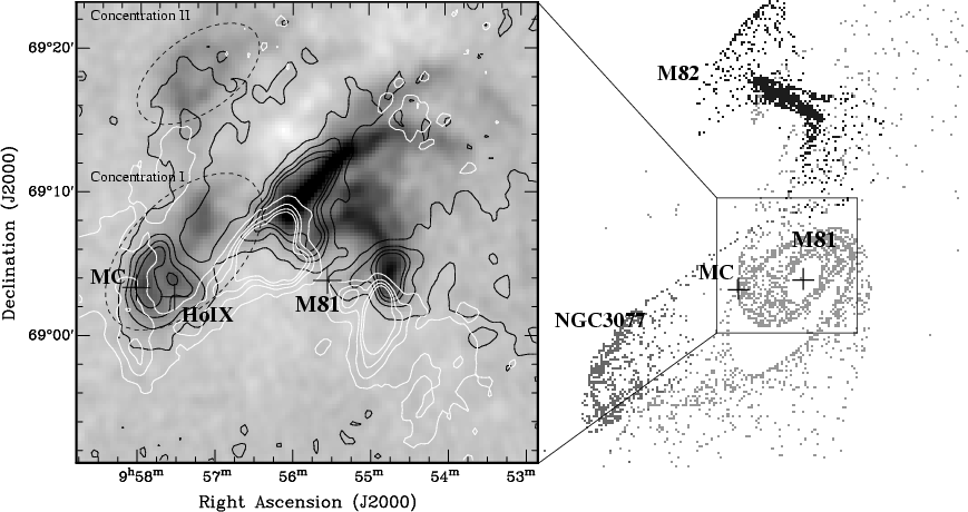 Figure 10: Left: H I emission integrated over [-132,239] km s-1 from Yun et al. (1994) overlaid with contours of the same emission integrated over [-80,0] km s-1 (white) and [0,80] km s-1 (black). The levels are respectively (0.15, 0.55, 0.95, 1.35) Jy/beam km s-1 and (0.1, 0.7, 1.3, 1.9) Jy/beam km s-1. The crosses show the positions of the molecular complex, Holmberg IX, and the center of M 81. Right: simulations of the interaction of M 81 with M 82 and NGC 3077 from Yun et al. (1993). |