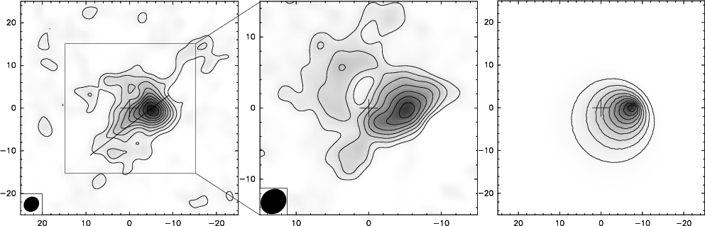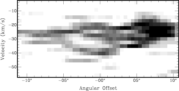 The channel maps of the model are overlaid in contours to the CO(1-0) in Fig. 2 and its integrated intensity is shown on the right-hand side of Fig. 1. While it does not reproduce the details of the individual CO(1-0) channel maps correctly, it reproduces the general trend noted above. It is interesting to note here that this interpretation of the morphology and dynamics of the CO emission would provide an explanation of the discrepancy by a factor of 10 between the virial mass and the molecular mass determined from the CO line intensity noted in BHB92, as the complex would then be gravitationally unbound.