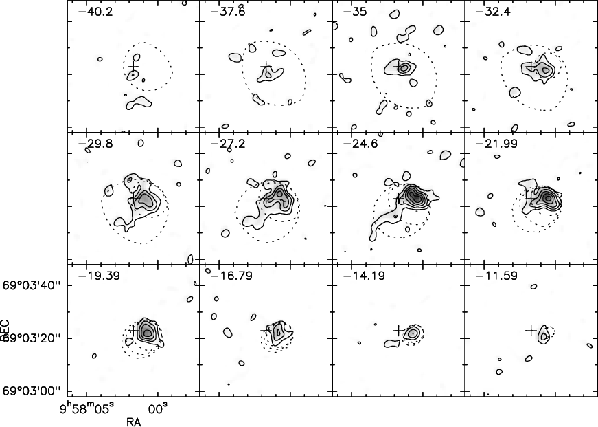 What does it imply for the complex? The velocity of the complex is consistent with the first H I component (-35 km s-1). Therefore, it could be cospatial to this component which we just showed could itself be cospatial to Concentration I (the second H I component) and be inside the extreme outer disk of M 81. Thus, despite the velocity difference, it is not excluded that the molecular complex is inside or very close to Concentration I and in the disk of M 81.