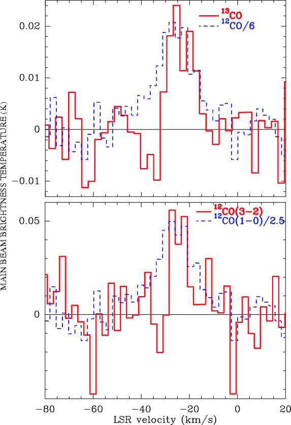 In Feb. 1998 the 12CO(2-1) (230 GHz) line emission was observed with the 8-beam array at the NRAO 12 m. The same 256-channel filterbank was used, as well as an hybrid spectrometer of 300 MHz bandwidth. The system temperature was in the range 800-1400 K. The FWHM beam size is 27''.